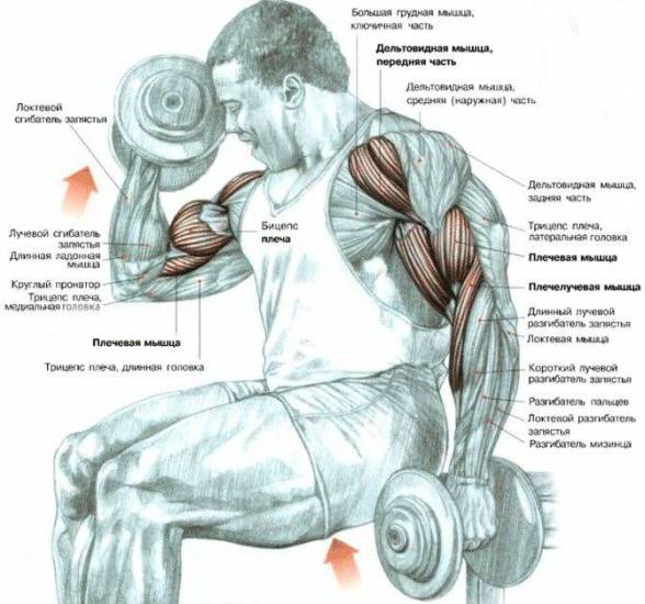 Это упражнение идеально подходит для общего развития бицепса, его массы и формы. Это упражнение работает на удлинение и утолщение бицепса, давая большую нагрузку на его нижнюю часть. Благодаря этому упражнению бицепс выглядит так, словно он вырывается из предплечья.