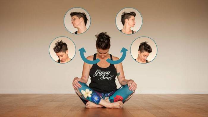 Оставаясь в Сукхасане, начнём разминать мышцы шеи.