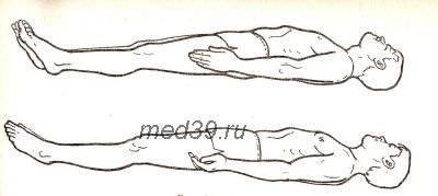 Исходное положение. Лягте на коврик на спину, пятки и носки ног вместе, руки прижмите к туловищу, смотрите прямо вверх.(см.рис)