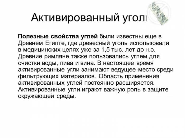 В инструкции активированный уголь заявлен как лекарственное средство при отравлениях, различных инфекциях организма, аллергиях. Это своеобразный фильтр, собирающий в организме всю грязь и выводящий ее.
