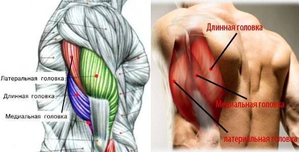 Трицепс состоит из трех головок: