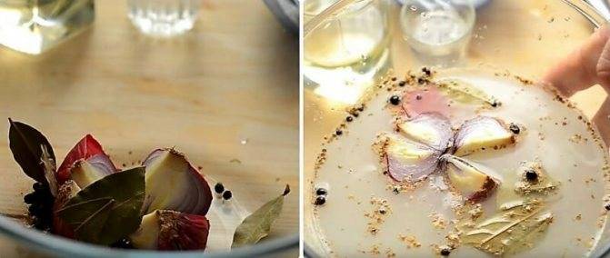 Важно: если остальные специи провариваются в луковом отваре, то горчица засыпается в бутылку вместе со скумбрией и заливается готовым маринадом