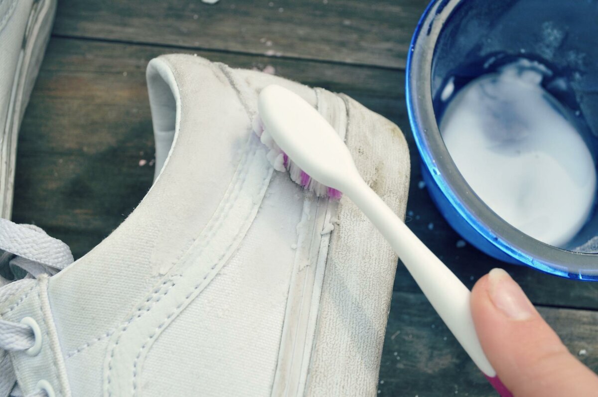 Паста или зубной порошок. Берем зубную пасту или зубной порошок, смешиваем с небольшим количеством геля для мытья посуды. Получившейся смесью чистим обувь. Можно сделать это старой зубной щеткой. В завершении протираем кроссовки или кеды влажной тканью.