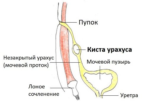 Киста урахуса – это одна из редких причин данной проблемы. Урахус или мочевой проток – это трубка, соединяющая мочевой пузырь эмбриона в утробе матери с пуповиной. Еще до рождения в норме эта трубка закрывается, но у некоторых случаях не полностью. У таких людей в более позднем возрасте в незакрытом урахусе может образовываться киста – образование, заполненное жидкостью. Если она инфицируется, это может привести к вытеканию мутной или кровянистой жидкости из пупка. К другим симптомам кисты урахуса относятся боль в животе, при мочеиспускании и лихорадка.