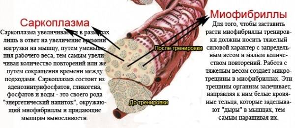 Существуют два типа гипертрофии мышц — Миофибриллярная и Саркоплазматическая. Первая дает рост мышц за счет увеличения объема клеток мышечного волокна (при этом их число практически не меняется), вторая — за счет увеличения питательной жидкости, окружающей это волокно. Мускулатура, полученная в результате разных типов гипертрофии, отличается друг от друга. М- гипертрофия характеризуется «сухими» и подтянутыми мышцами, тогда как С-гипертрофия — скорее «накачанными» и объемными. Различные виды нагрузок приводят к разному типу гипертрофии.