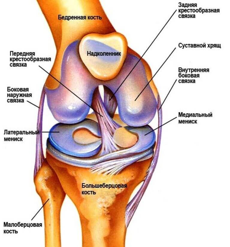 Коленный сустав формируют бедренная, большеберцовая кость и надколенник. Кости соединяет между собой и фиксирует связочный аппарат, который включает в себя такие элементы: