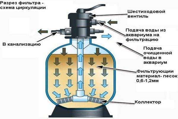 Общая схема песочного фильтра предполагает наличие: