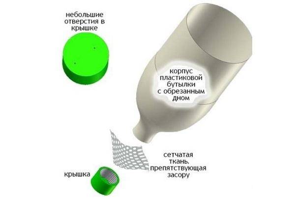 - Если бутылка будет закопана горлышком вниз, то отверстия проделываются в крышке. Донышко в этом случае надрезается так, чтобы получилась крышечка, или срезается совсем. Горлышко прикрывается кусочком капрона или марли, крышка навинчивается на своё место.