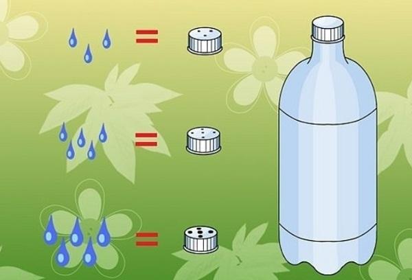 - В крышке бутылки шилом или толстой иглой прокалываются 3-7 отверстий. Их число зависит от того, какой уровень влажности нужен конкретному растению и от плотности почвы.