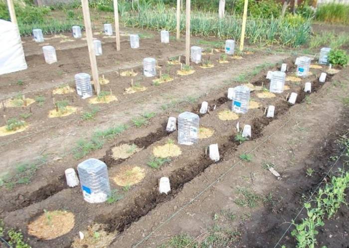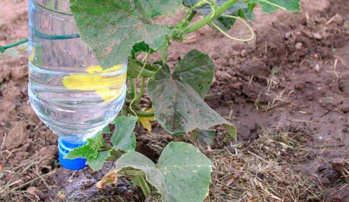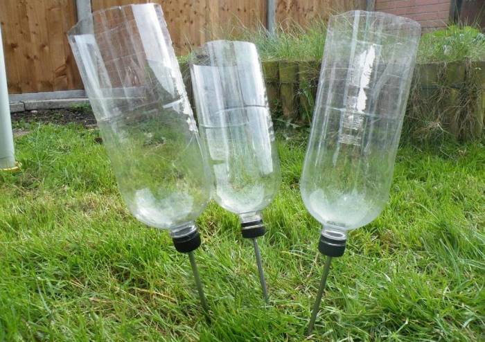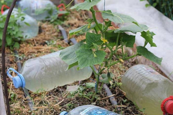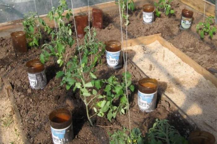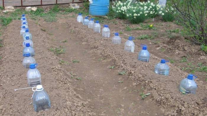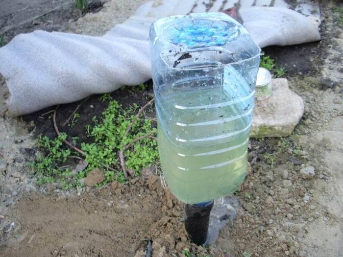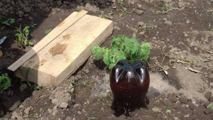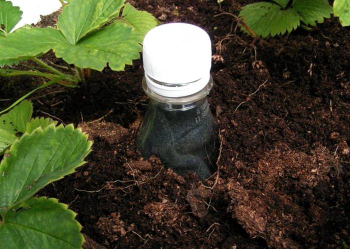 Бутыль вкопать рядом с растением на всю глубину. Предварительно срезать верх и с одной стороны боковины проделать 2 – 4 отверстия. Останется только регулярно заливать воду в эту емкость.