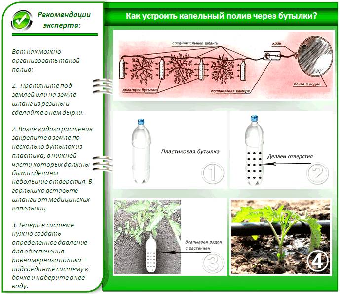 При применении бутылочного полива важно не допускать перерасход воды, иначе почва испортится, да и влага быстро уйдёт в землю. В целом же, точечное орошение позволяет значительно повысить урожайность, и в то же время предотвратить рост сорняков