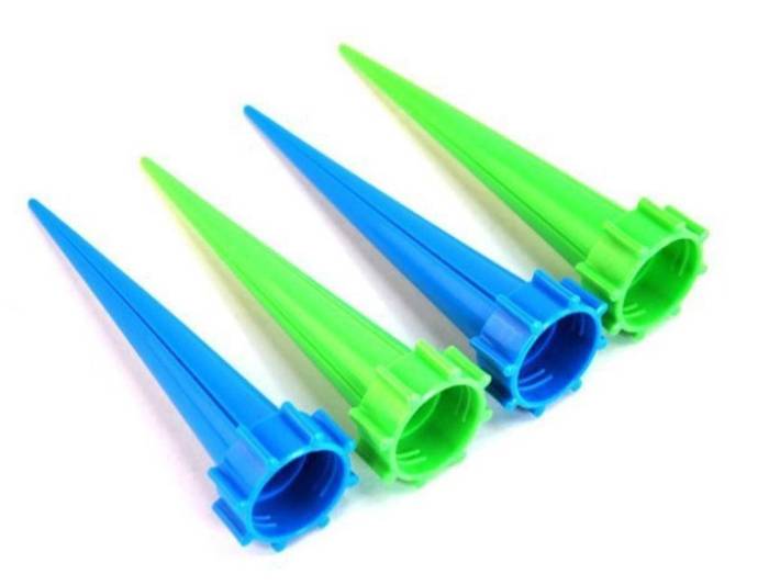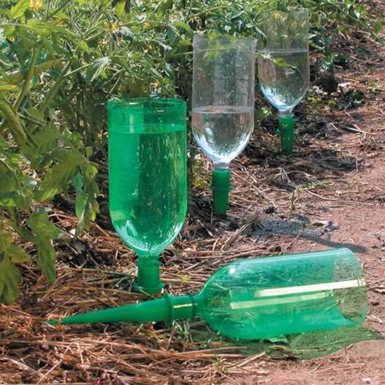 Завалялись специальные заостренные наконечники для пластиковых бутылей, можете их также использовать в изготовлении полива. С помощью наконечников можно легко установить емкости с водой возле растения, но придется немного укоротить бутылку, чтобы придать хорошую устойчивость. Будете выбирать, стоит ли использовать наконечники, ведь уменьшится количество воды.