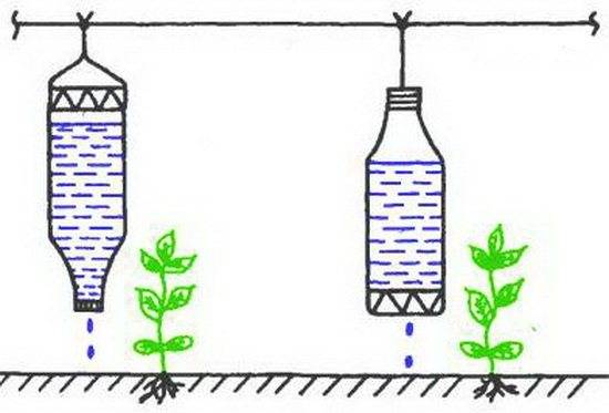 Такую систему удобно разместить именно в теплице, так как там можно подвесить бутылки к опорам.