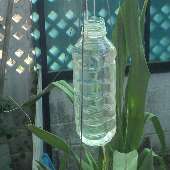 Теперь нужно развесить бутылки над растениями, после чего работы по изготовлению «системы орошения» можно считать завершёнными.