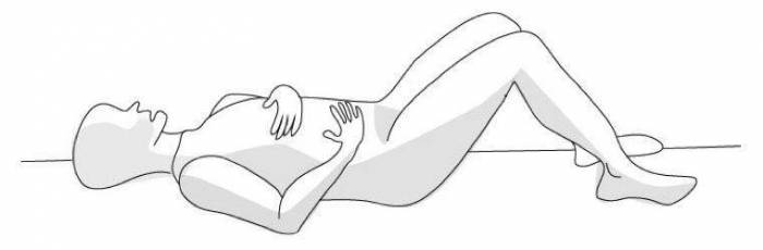 Чтобы выполнить диафрагмальное дыхание правильно, лягте на пол, под голову положите небольшую подушечку, одну руку положите на живот, другую на грудь. Вот так: