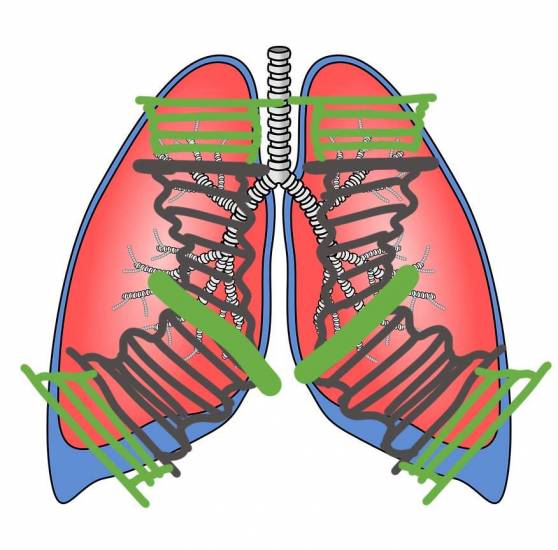Нижняя доля каждого лёгкого схематично представляет из себя гармошку с фиксированной стороной ближе к центру тела. Раздвигайте легочную гармошку во время каждого вдоха в стороны, чтобы усилить дыхание нижними долями легких. Научитесь дышать чтобы это происходило автоматически.