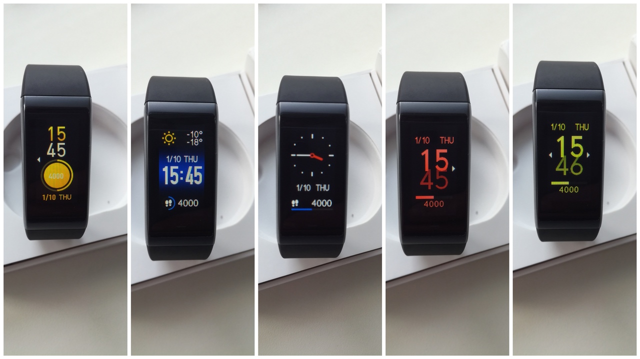 - Изменение внешнего вида интерфейса. Производитель предлагает 5 разных вариантов того, как может выглядеть дисплей браслета. На нем одновременно указывается время, дата, текущие сведения о погоде, число пройденных за сегодня шагов. День недели во всех случаях отображается на китайском языке.