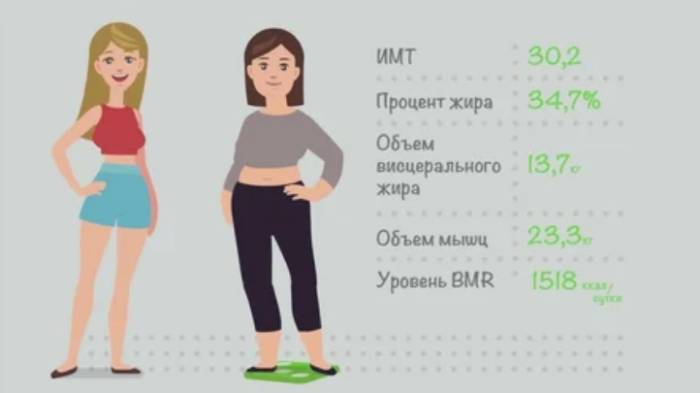 - Соотношение веса и жира в процентах.