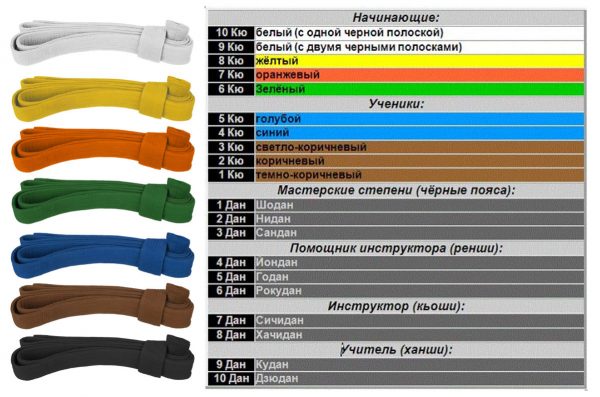 Цвет пояса отражает уровень мастерства спортсмена. Существует четкая градация: ученический уровень — кю, уровень мастера — дан. Последовательность получения поясов следующая: