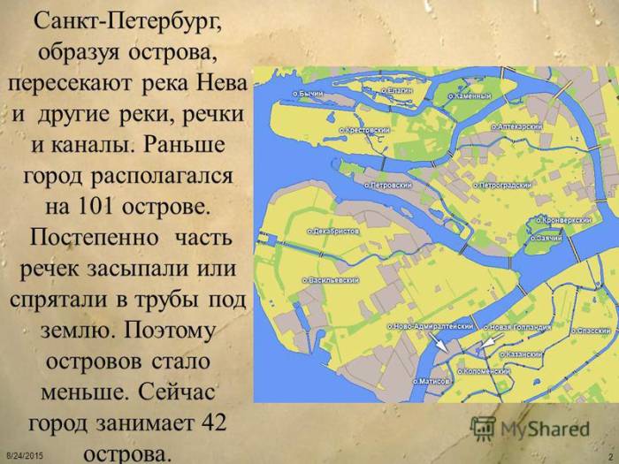 В конце XIX века дельта Невы состояла из 48 рек и каналов, образующих 101 остров, сегодня на карте Санкт-Петербурга расположено 42 острова.