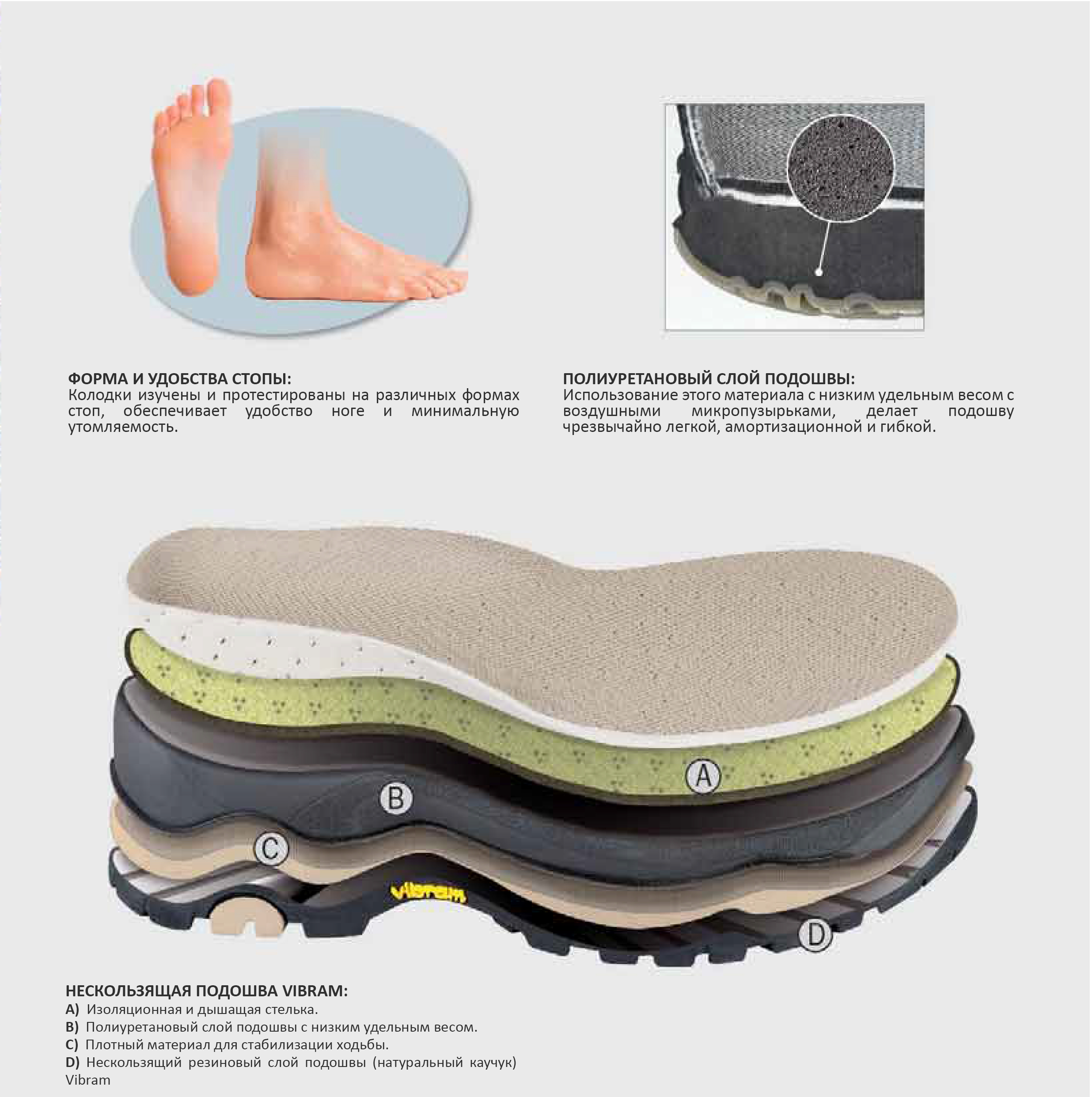 Много в треккинговой обуви значит подошва. Она должна быть качественной — только тогда ботинки прослужат много лет и будут пригодны для сложных путешествий. Обычно подошва изготавливается из вулканизированной резины изрезанной текстуры, что позволяет обуви не скользить на камнях или по льду.
