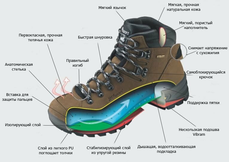 | Подошва | Прочная резина с глубоким протектором (для сцепления), Vibram (известный производитель высококачественных подошв), жесткость подошвы должна соответствовать типу местности (мягче для ровных поверхностей, жестче для неровных) | Проверьте протектор на износ. Обращайте внимание на износостойкость материала подошвы. |