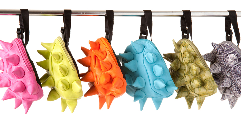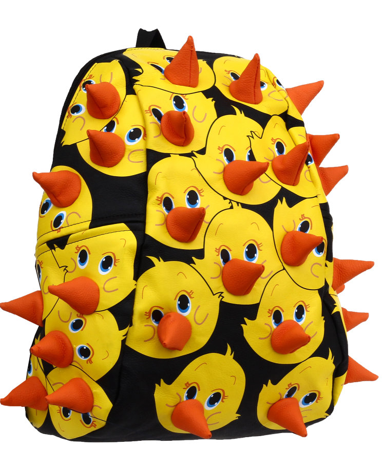 Spiketus Rex. Яркие рюкзаки с шипами, напоминающими кожу дракона или динозавра. Модели ориентированы на школьников-мальчиков, но популярны и у студентов и взрослых мужчин. Аксессуар вызывает ассоциации с силой и мужественностью, но также и с мягкостью. Шипы безопасны, изготовлены из мягкого спандекса, что исключает травмы. Этот материал практичен: декоративные элементы сохраняют форму и не изнашиваются. Появились модели с игривым дизайном, где шипы стали клювами уток и куриц, а также используются ткани с соответствующими принтами.