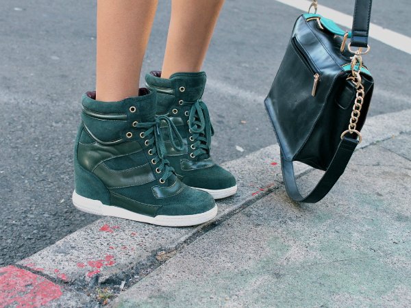 - Танкетка — обычная или скрытая, она не только увеличивает рост на несколько сантиметров, но и более анатомична, полезна для осанки, нежели плоская платформа. Стройные модницы могут позволить себе любые вариации таких сникерсов, а обладательницам пышных форм лучше остановиться на невысоких моделях.