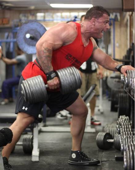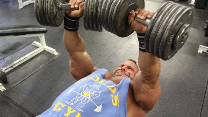 После легкой предварительной разминки IFFB pro Стив Сильверман занимается с меньшими, но более тяжелыми гантелями.