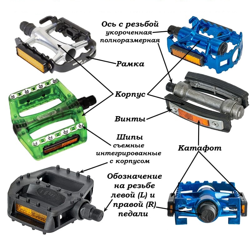 Педали могут иметь контргайки, колпачки, чашки, накладки и светоотражатели. Сложные конструкции труднее разбирать, а ремонт может усложниться из-за дополнительных элементов и закрученной фурнитуры. Контактные педали и велотуфли требуют особого подхода из-за отличий в монтаже.