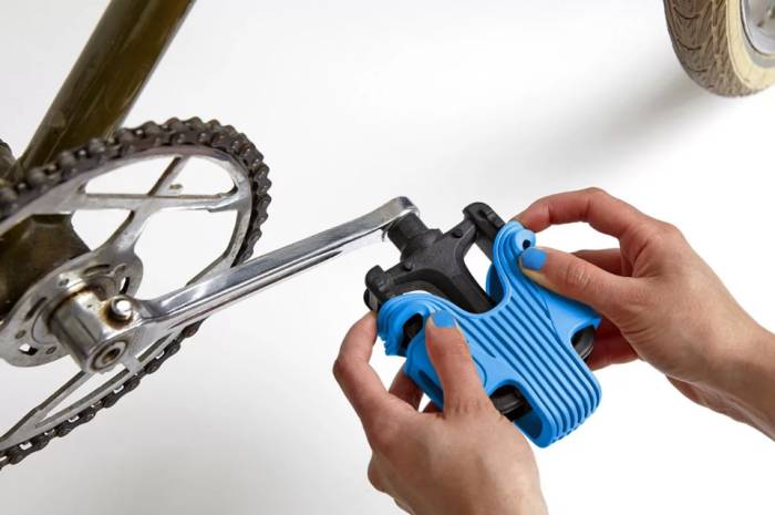 После снятия педали велосипеда обязательно очищают, детали смазывают. Смазка может быть как обычной, так и специальной. Безворсовая мягкая тряпка заменит ветошь. Излишки смазки обязательно удаляют. Контактные педали для шоссейного или спортивного велосипеда снимают такими же инструментами.
