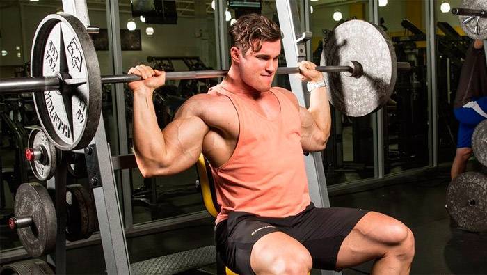 Несмотря на то, что это всё тот же жим штанги, его выделяют в отдельную категорию. Оптимально выполнять движение сидя в тренажере Смита, для минимизации травм и возможности брать максимальный вес.