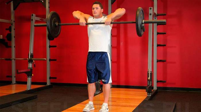 - Встаньте ровно (или сидя на скамье со спинкой 90 градусов). Снимите гриф и зафиксируйте на уровне ключицы. Удерживайте вес широким хватом;