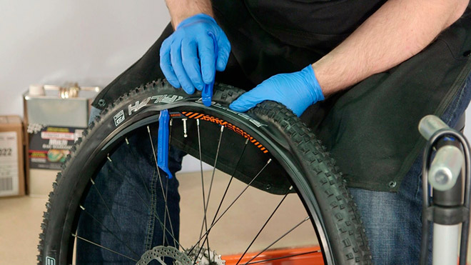 | 6. Установка покрышки | Наденьте одну сторону покрышки на обод. Затем, аккуратно, натяните вторую сторону, используя пальцы, а затем монтажные лопатки (если необходимо). | Монтажные лопатки |
