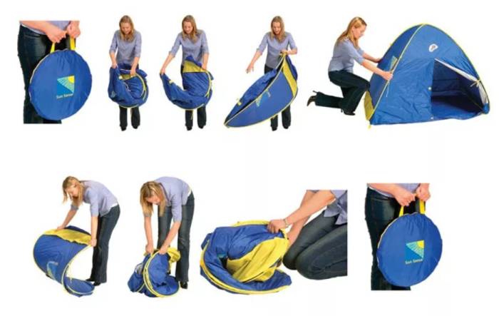Сначала необходимо сложить палатку в одну плоскость. Должен получиться квадрат, прямоугольник либо треугольник. Затем соединить вместе две стороны, уложить их на землю. После чего требуется потянуть на себя один конец и прижать его к противоположному краю. Конструкция примет форму восьмерки, затем нужно докрутить ее и зафиксировать. В сложенном виде изделие следует упаковать в специальный чехол для хранения либо перевозки.