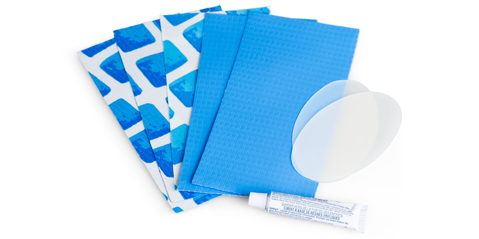 Набор для холодной вулканизации подходит для восстановления надувных бассейнов. Он включает тюбик с клеем и несколько латок для камер. Процесс ремонта аналогичен ранее описанному: после накачивания бассейна, при необходимости, заплатка немного растягивается.