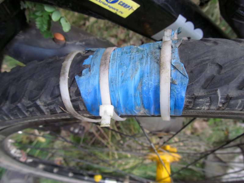 Во время прокола в поездке не всегда можно воспользоваться ремкомплектом. Существуют альтернативные способы временно заклеить велосипедную покрышку без клея, чтобы добраться до дома. Один из вариантов — обмотать место повреждения изолентой. Другой способ — использовать полиэтиленовый пакет: смочите небольшой кусочек водой и приложите его к отверстию, затем накачайте колесо, чтобы полиэтилен плотно вжался в прокол.