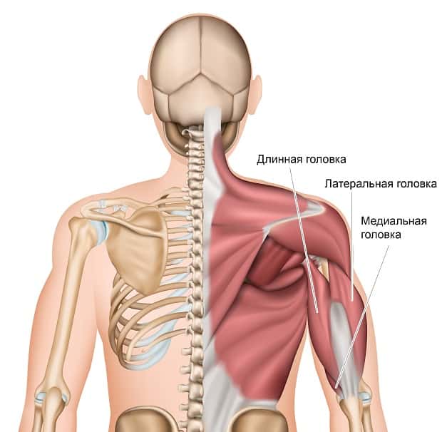 Практически во всех упражнениях, когда разгибание производится из-за головы или с поднятыми руками, максимально работает длинная и медиальная головки, а латеральная — в меньшей степени. В жиме узким хватом, разгибаниях на блоке вниз и кикбэках, наоборот, длинная головка получает меньшую нагрузку