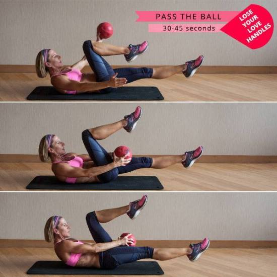 Это упражнение также позволяет отлично растянуть поясницу. Зажав мяч между ног, вы облегчаете себе задачу держать ноги вместе. Выполните 3 подхода по 8-10 повторений с каждой стороны.