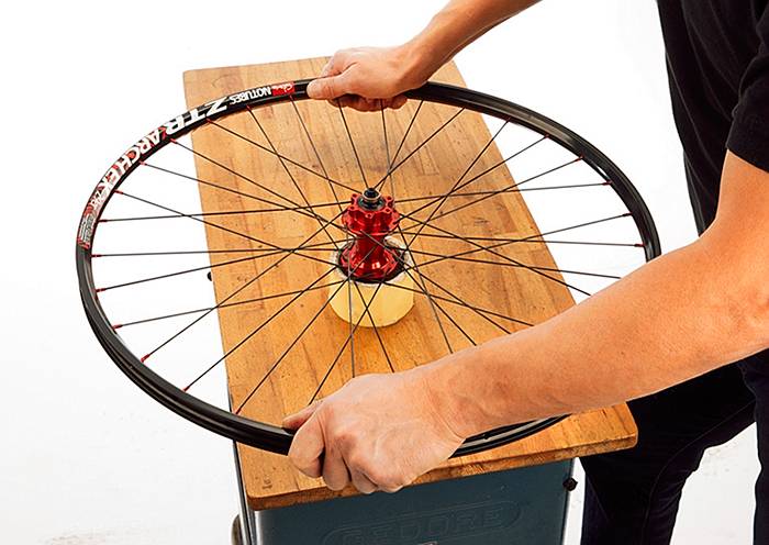 Чтобы выпрямить таким методом обод, нужно обладать физической силой. Для исправления большой деформации лучше позвать помощника, который будет удерживать велосипедное колесо, прижимая его к полу. Если приложить достаточную силу, искривление сгладится.