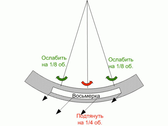 - Натяните соседние спицы на ту же величину, на которую ослабили центральную, постепенно продвигаясь к краю «восьмерки».