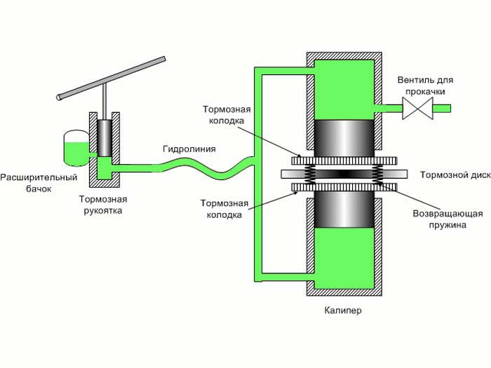 В отличие от механических дисковых тормозов, в гидравлической системе усилие от тормозной ручки передается посредством тормозной жидкости. То есть усилие уже не механическое: тросик отсутствует, тянуть нечего. В гидролинии находится тормозная жидкость, которая толкает суппорты в тормозной машинке.