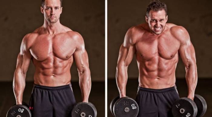 Накачать трапецию можно только малоповторным тренингом, вес гантелей следует подбирать, чтобы мышечный отказ наступал на 7-10 повторе.