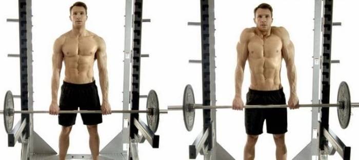 Со штангой. Для мужчин этот вариант кажется самым эффективным. Необходимо стать в исходное положение – ноги и хват на ширине плеч, поясница слегка прогнута, грудина расправлена, в выпрямленных руках штанга. Поднимаем плечи вверх, напрягая при этом трапеции. В наивысшей точке зафиксируйте позицию на пару секунд, опустите плечи. Шраги со штангой можно выполнять, держа инвентарь за спиной. Еще один вариант – тренинг в машине Смитта.