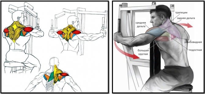 Первый момент, это положение Ваших плеч. В махах, плечи опускаются в основном под действием веса гантелей, здесь же Вы сидите вертикально, и плечи нужно будет, как бы заворачивать вовнутрь, чтобы максимально нагрузить заднюю дельту.