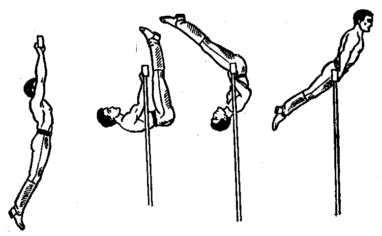 - При опускании ног руки выпрямляются, и занимающийся переходит в упор на перекладине.