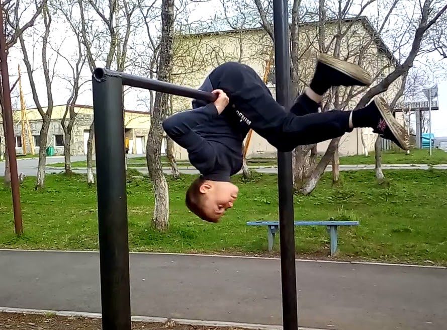 На низком турнике. Выберите высоту, чтобы стоять на ногах, например, перекладина на уровне плеч. Освоив переворот, можно поднять турник выше. В классическом варианте ноги при висе не касаются земли.