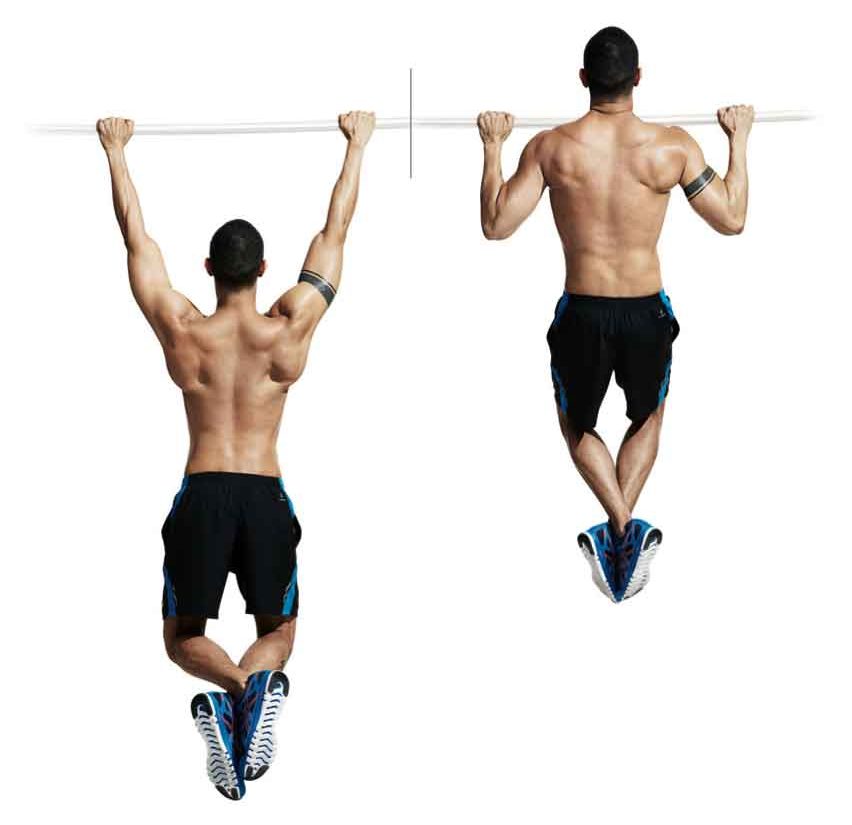 - Хват за перекладину средний: не слишком широкий и не слишком узкий. Не висите на турнике дольше 3–4 секунд, чтобы не утомить руки. Более сложный вариант — широкий хват.