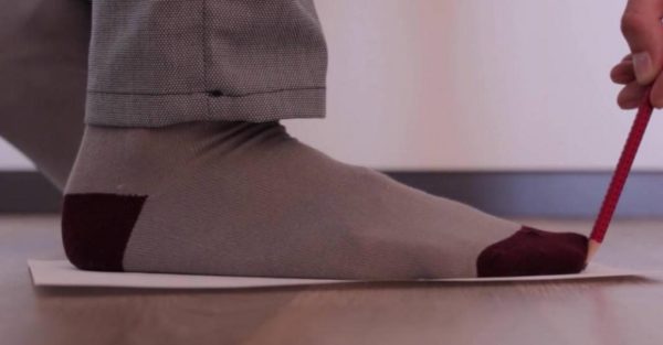 Важно, чтобы стопа плотно прижималась к полу. Лучше выполнять измерение в стоячем положении, а карандаш должен быть вертикальным при обведении.