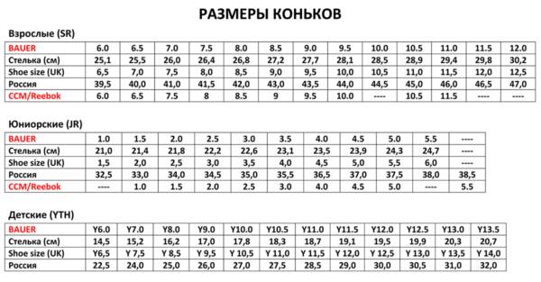 | Российский размер | Длина стопы (см) | Размеры Bauer |
